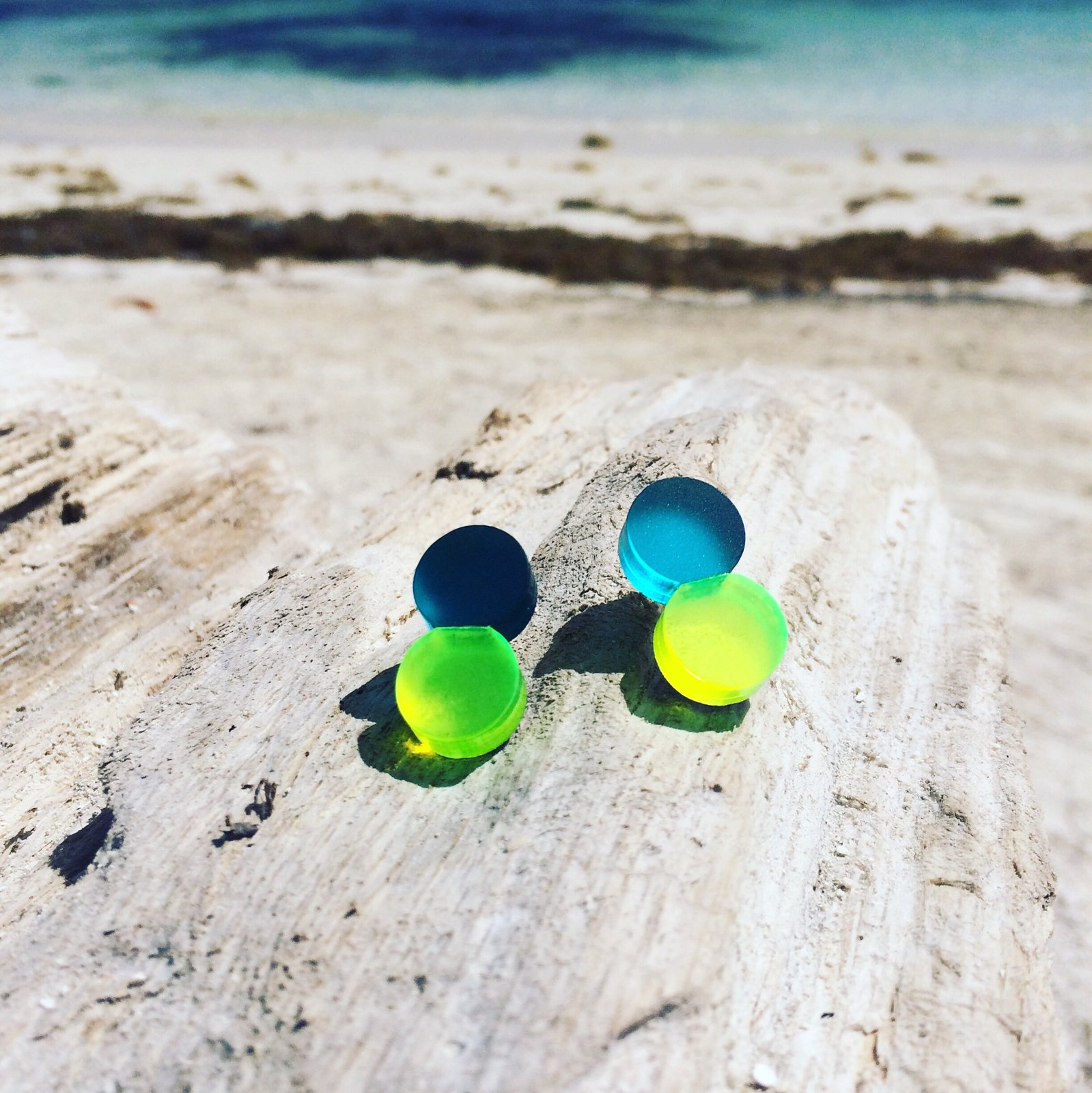 Tyto náušnice existuji v několika kombinacích 6 barev. Flourescentni zelené , fluorescentni červeného-oranžové , starorůžové, fuksiové růžové a tyrkysové, fialového perspexu.