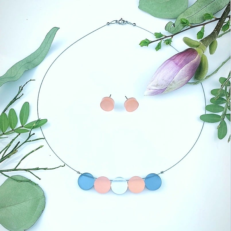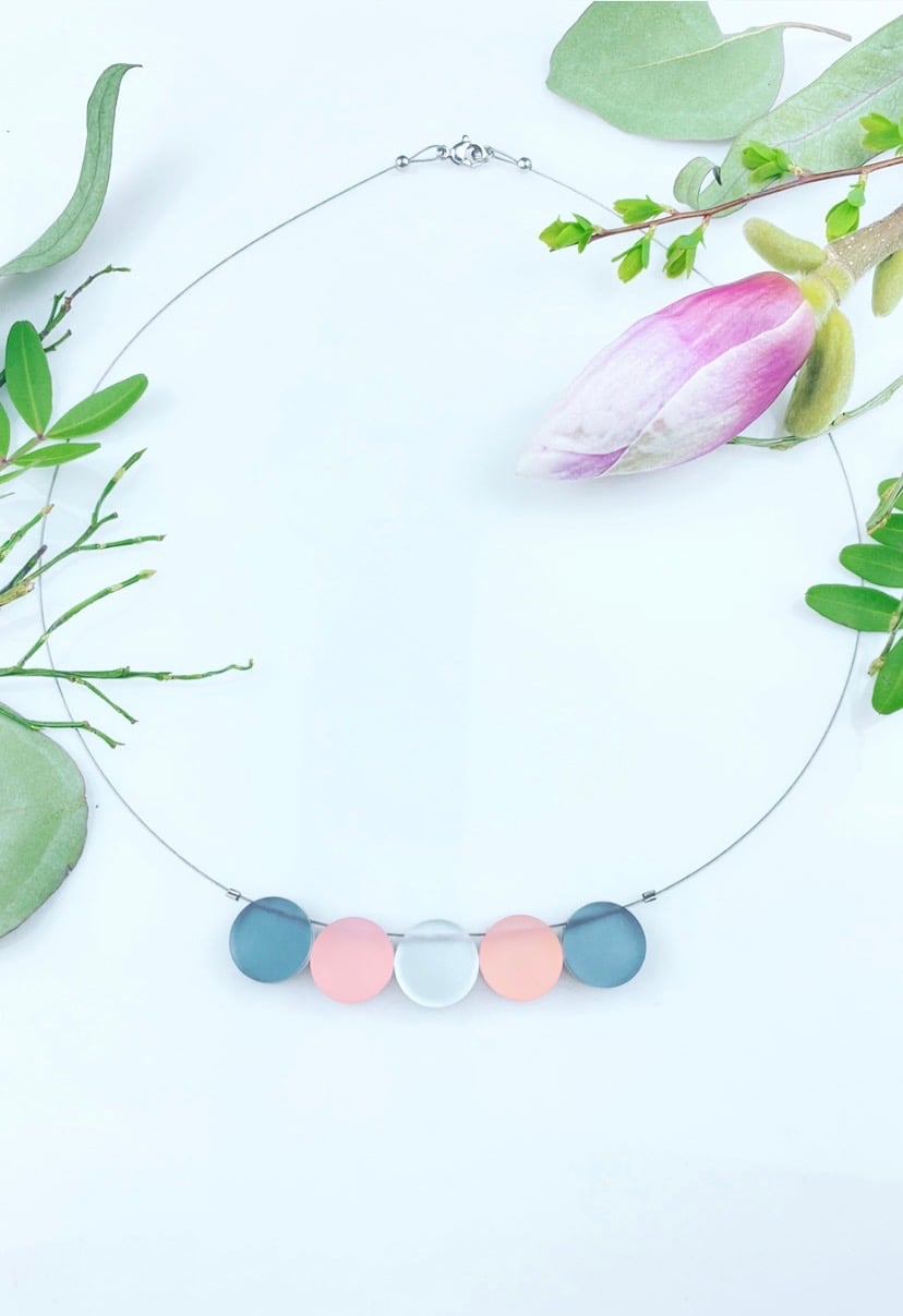 Náhrdelník Circle v kombinaci šedo - starorůžový - stříbrný je vytvořen z 5 segmentů barevného dvojvrstvého perspexu na kvalitním ocelovém lanku cca 48cm pokrytého nylonem s komponenty z chir.oceli - hypoalergenní, zavírání je na karabinku a očko.