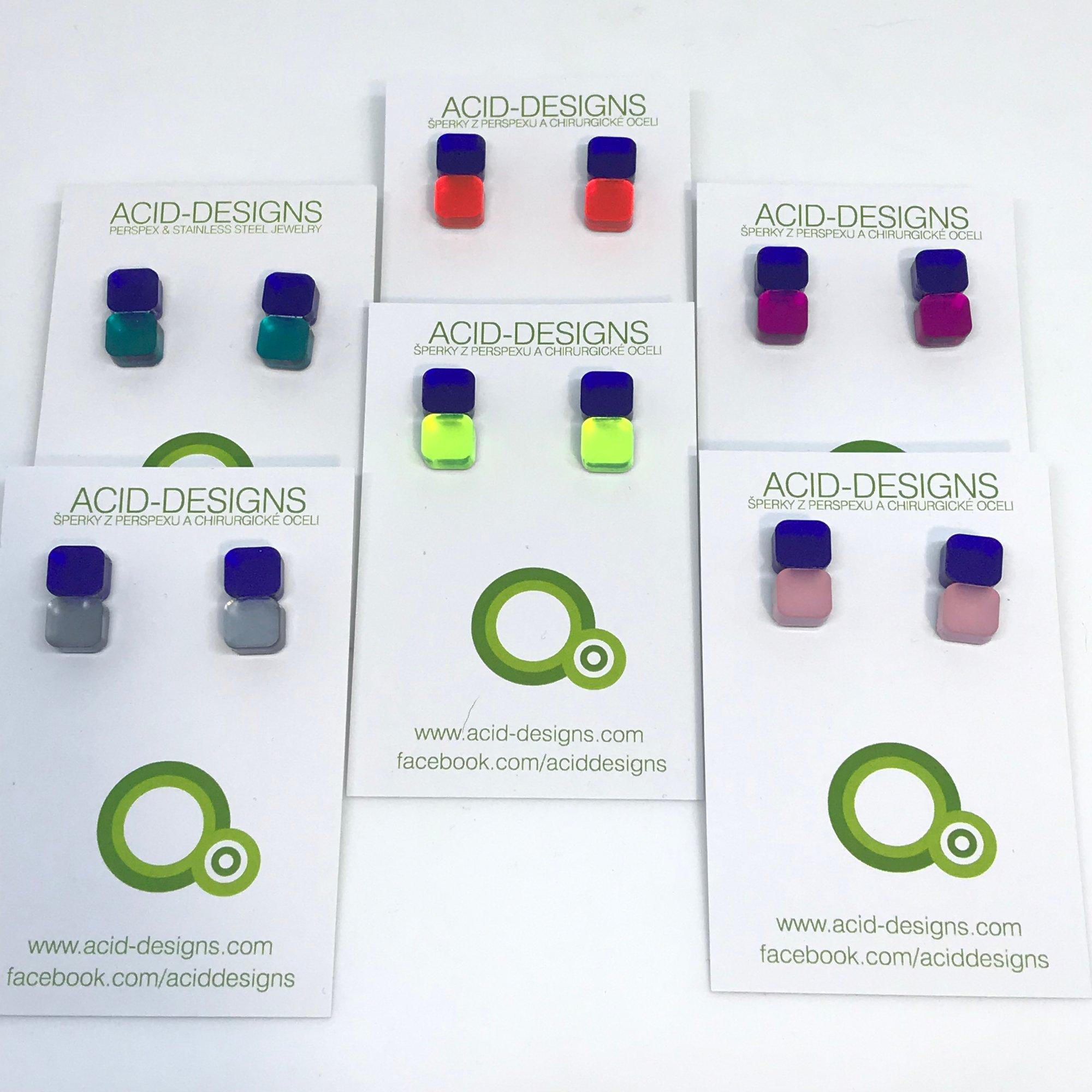 Náušnice jsou ze dvou vrstev materiálu, ručně lepého, základ je řezaný laserem a poté ručně kompletován - čisťen, broušen, lepen. Podklad barevné vrstvy je zrcadlový, barvičky jsou tak výraznější a mají krásné odlesky.