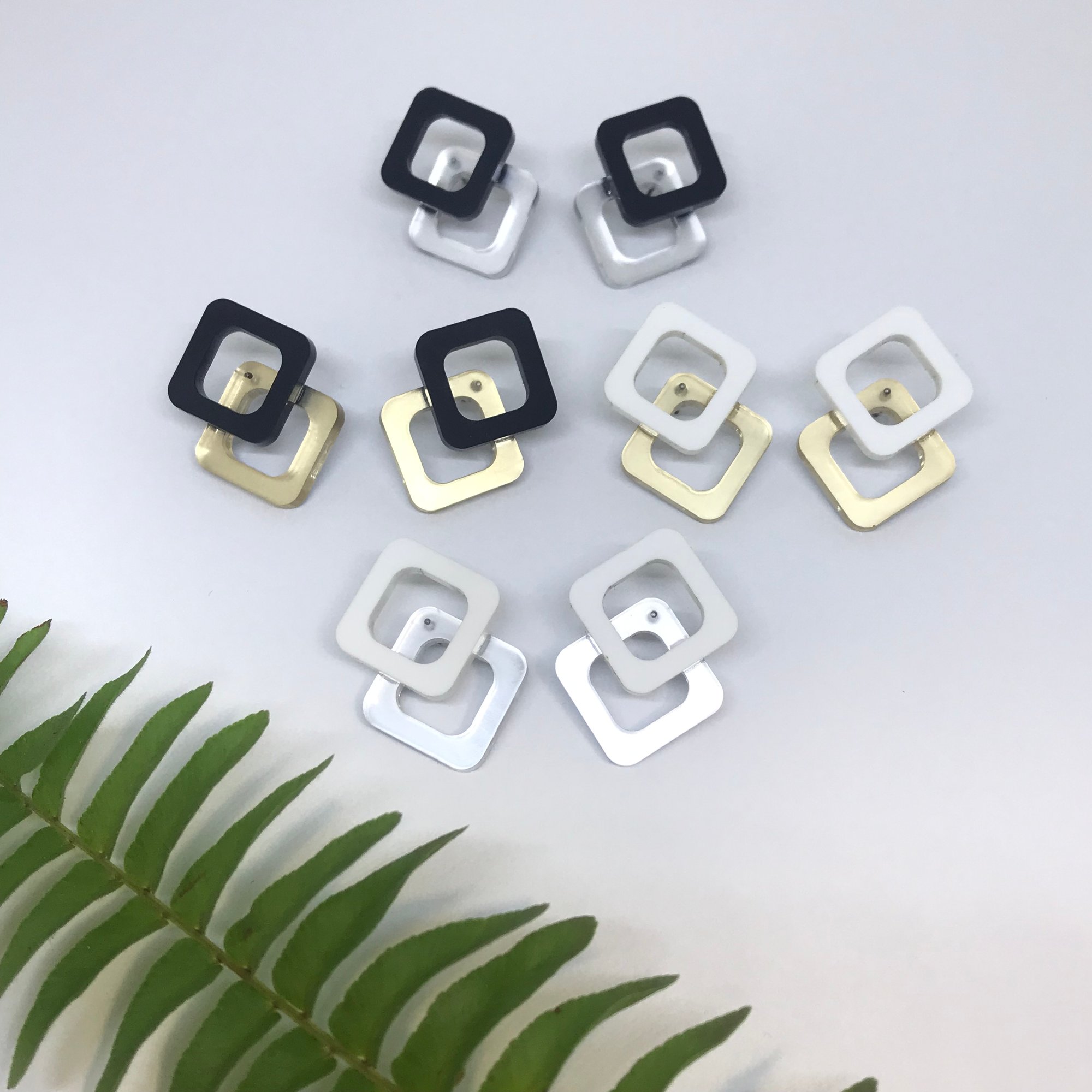 Náušnice vyrábím ze zrcadlové a matné vrstvy perspexu. Puzetka je z hypoalergenní chirurgické oceli a protidíl je silikonový.