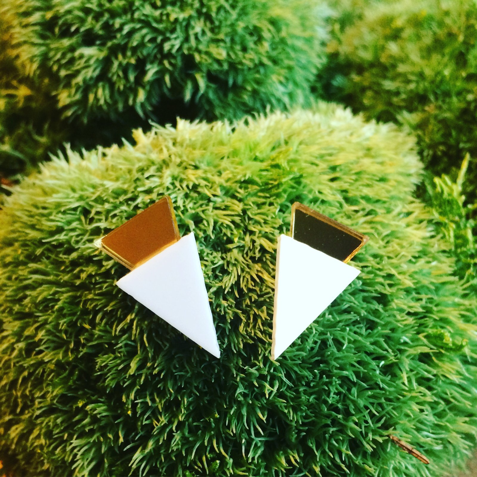 Tyto elegantní náušnice jsou vyrobeny z perspexu ve variantách - matná bílá nebo matná černá s podkladem ze zrcadlového perspexu v odstínech stříbrné a zlaté .