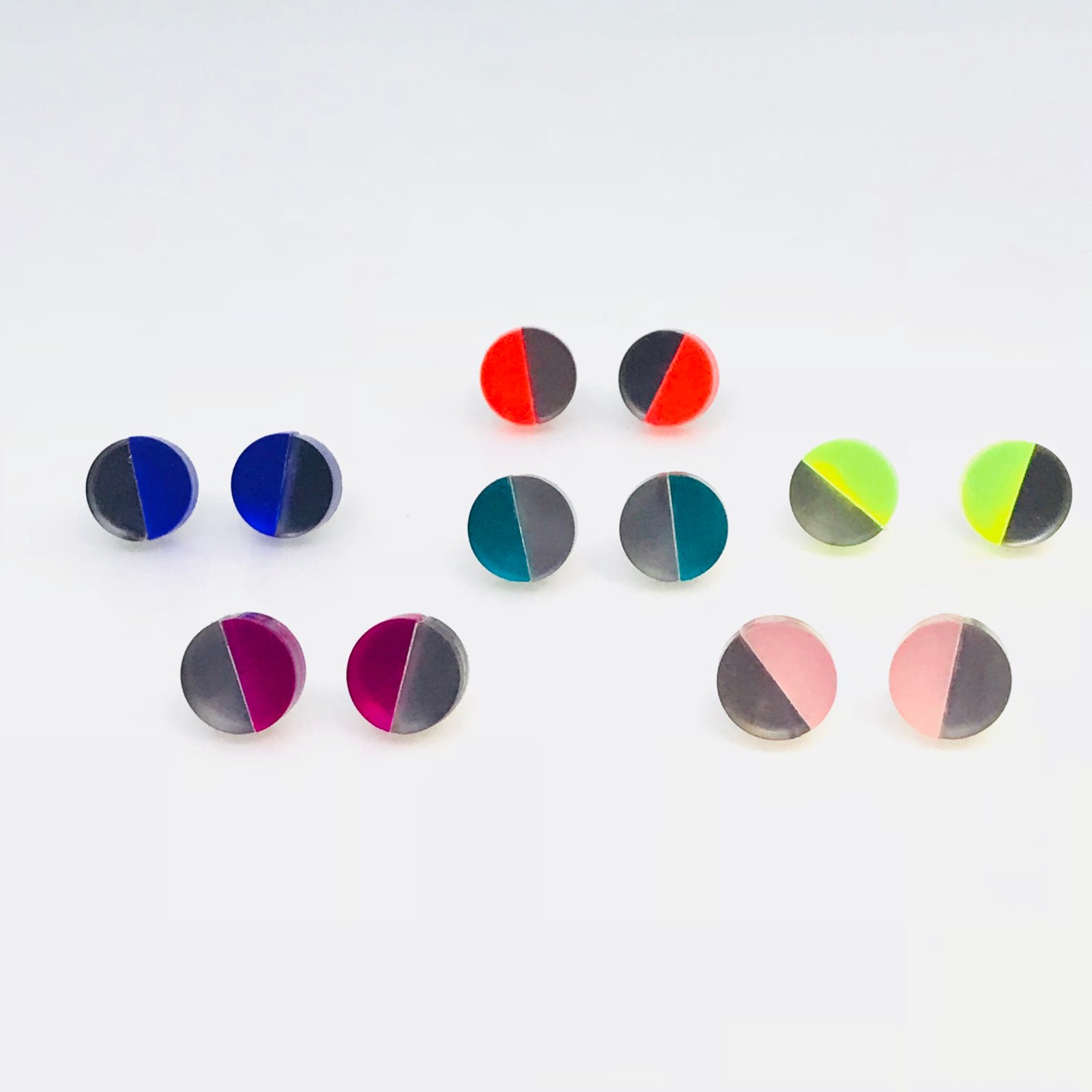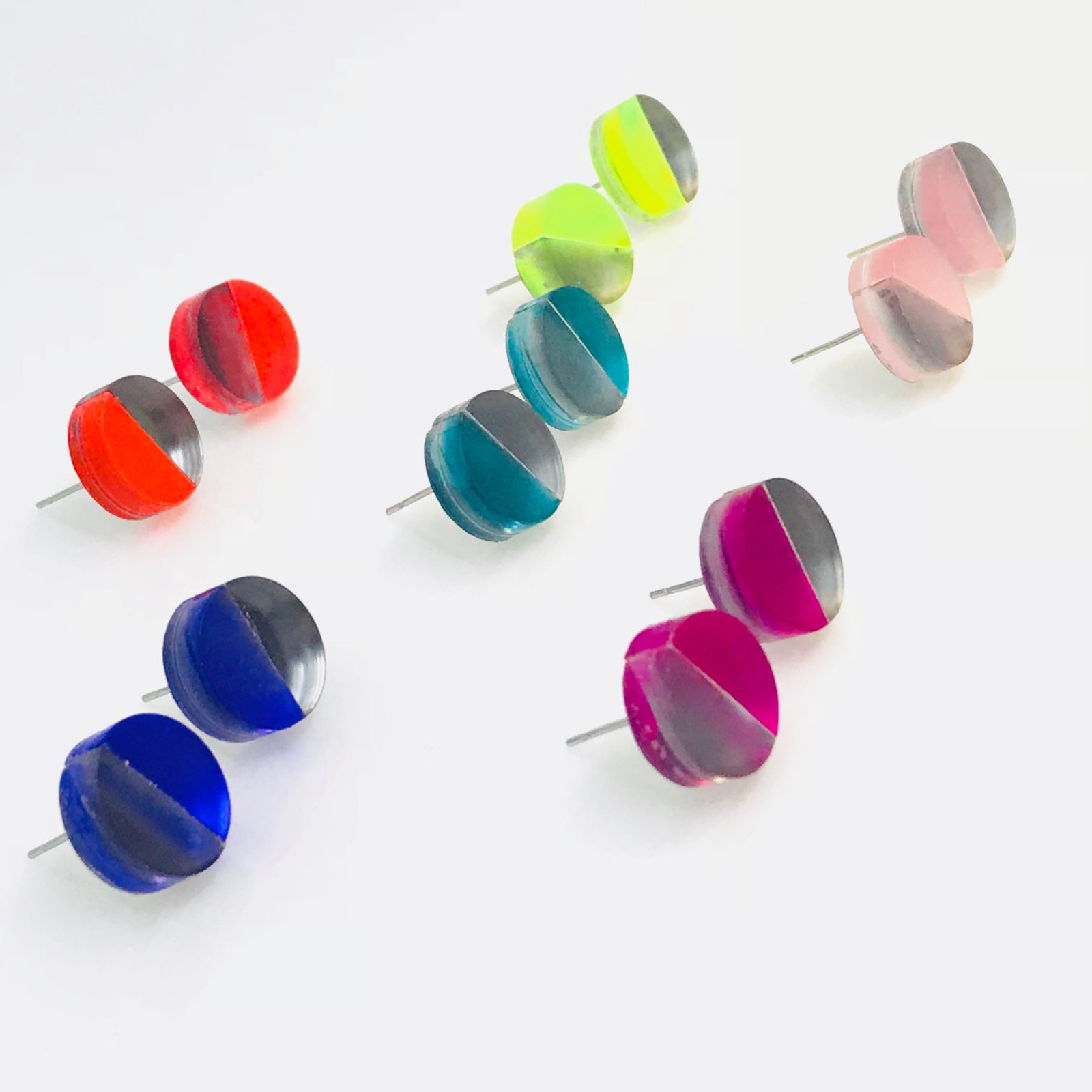 Náušnice jsou ze dvou vrstev materiálu, ručně lepého, základ je řezaný laserem a poté ručně kompletován - čisťen, broušen, lepen. Podklad barevné vrstvy je zrcadlový, barvičky jsou tak výraznější a mají krásné odlesky.