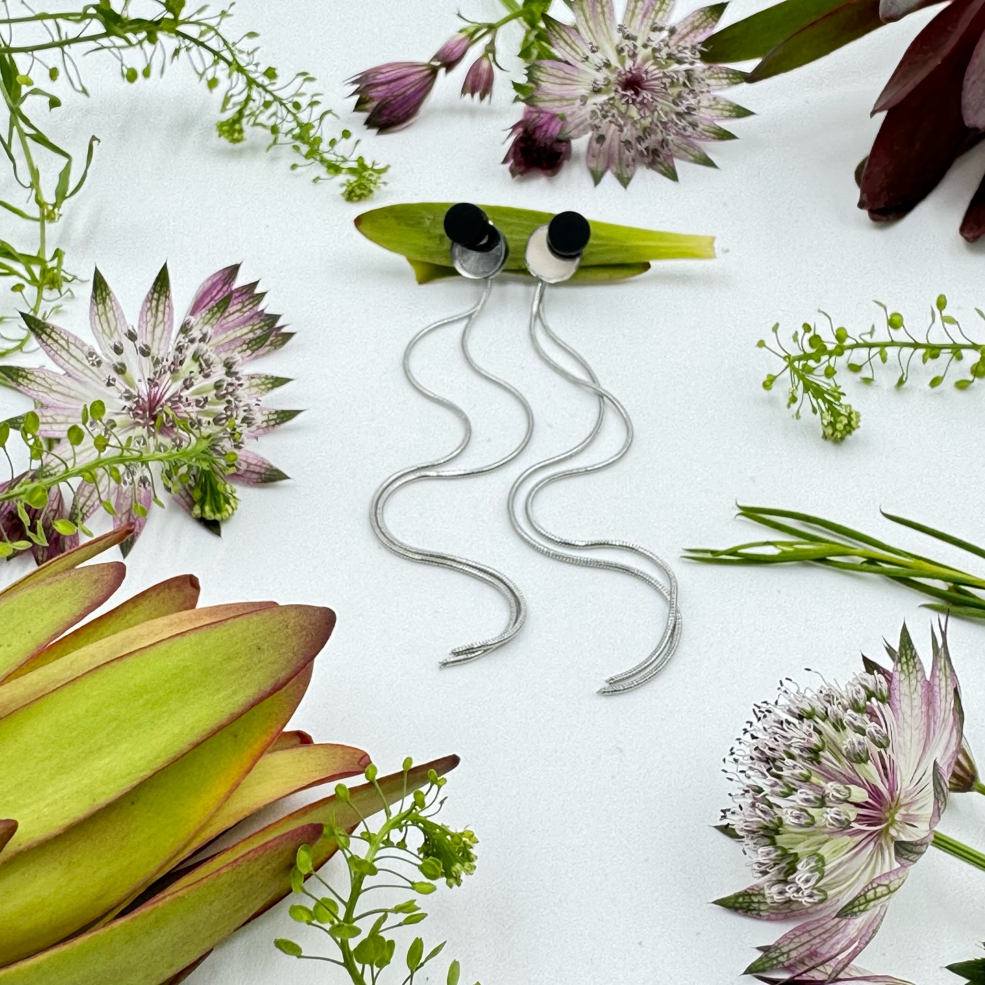 Tyto designové náušnice z dílny Essie Designs spojují čistý minimalismus s hravým detailem. Základ tvoří lehký a odolný Perspex, zatímco zadní zapínání s jemnými řetízky je z hypoalergenní chirurgické oceli, která zaručuje pohodlí a bezpečnost při nošení. Dostupné ve dvou barevných variantách – černé a bílé – jsou dokonalým doplňkem, který podtrhne váš styl a dodá vašemu outfitu nádech moderní elegance.