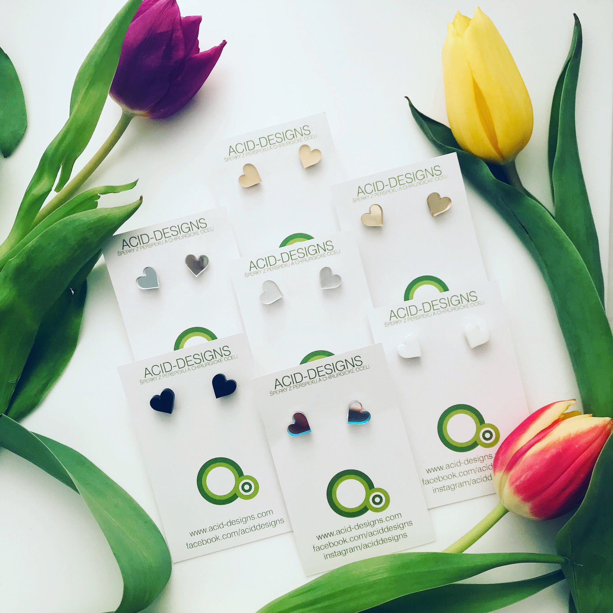 Tyto náušnice jsou vyrobeny ze zrcadlového perspexu v stříbrném nebo zlatém odstínu a budto lesklé nebo matné -broušené variantě a také je vyrábím v matném bílém nebo černém perspexu. Zrcadlové mají velmi působivé odlesky.
