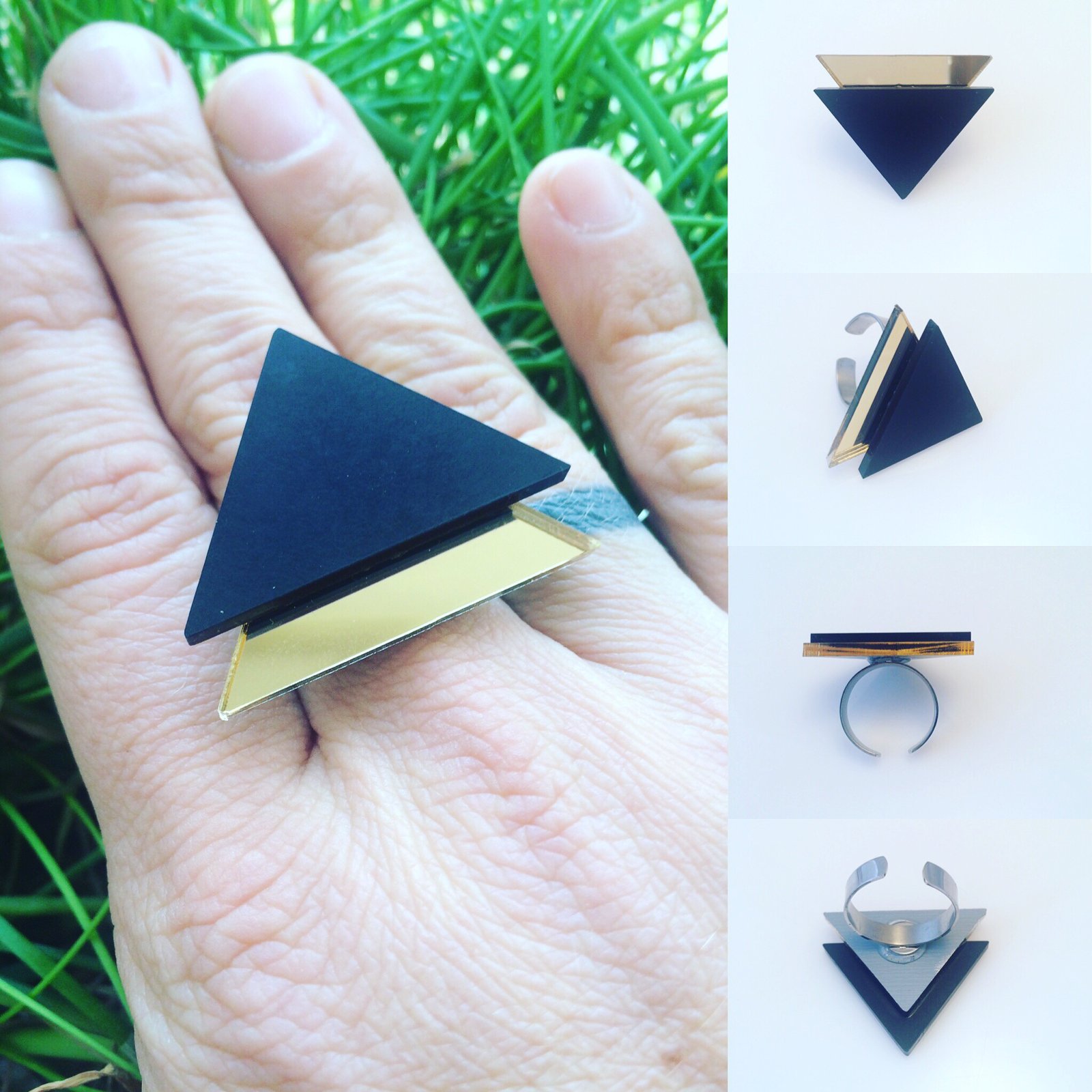 Materiál , který zdobí prsten je ze dvou vrstev perspexu - matné černé v kombinaci se zrcadlovou - zlatou, měděnou a stříbrnou.
