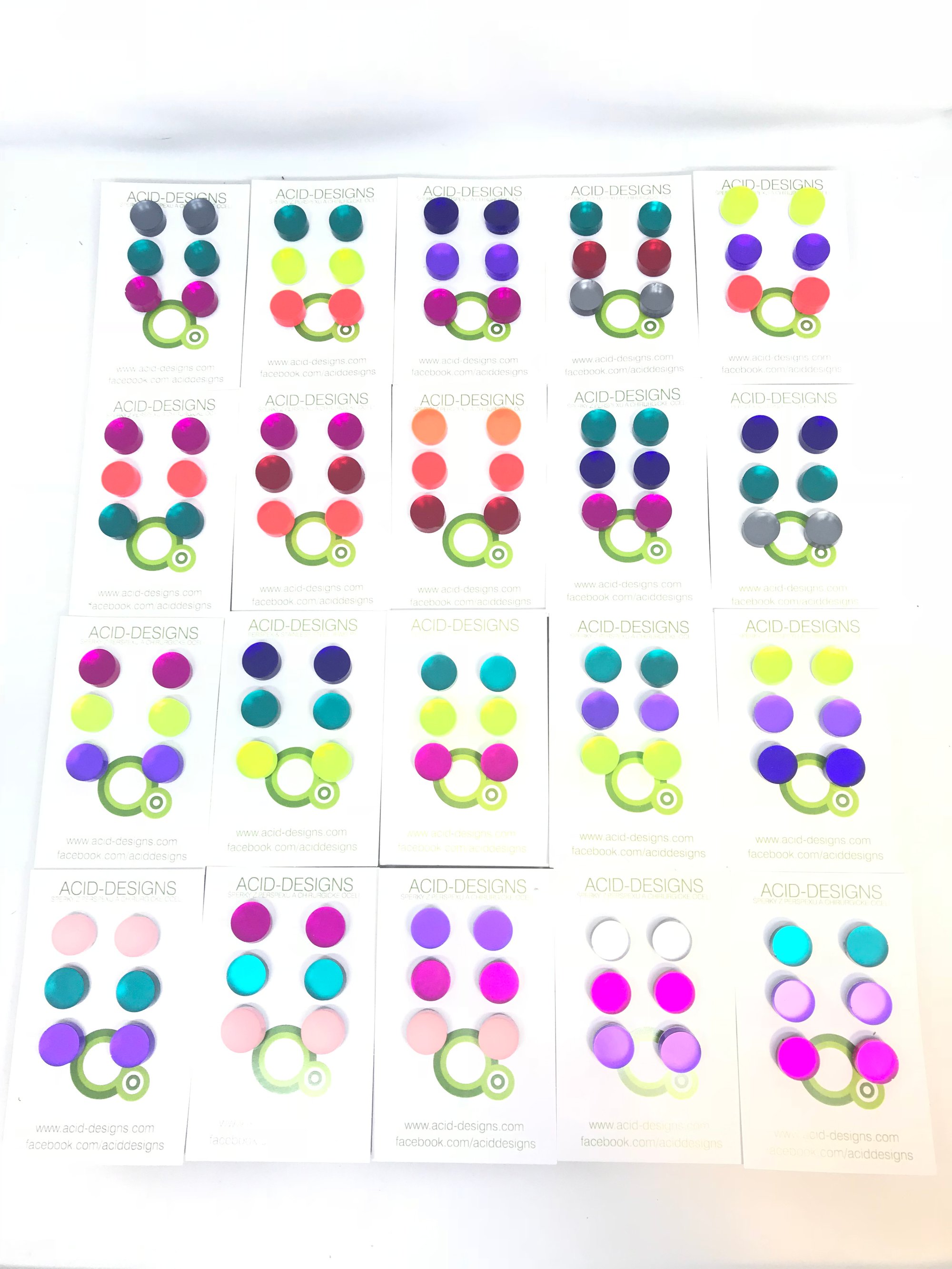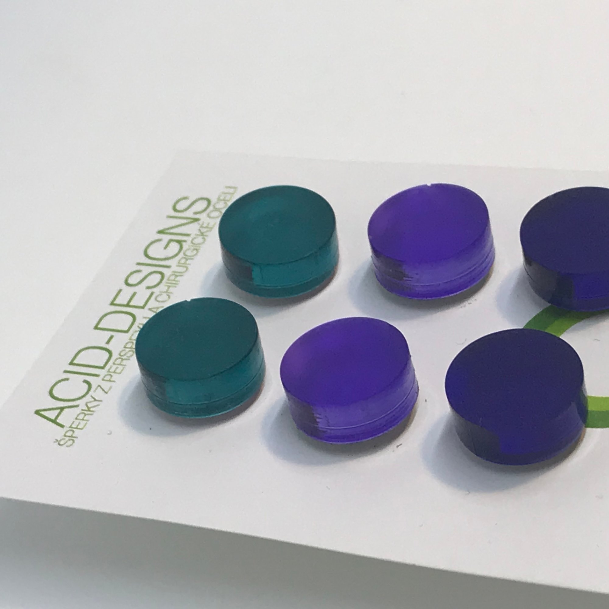 Tyto náušnice jsou vyrobeny ze dvou vrstev - barevného perspexu a zrcadla z perspexu , barvy jsou tak výraznější a mají velmi působivé odlesky.