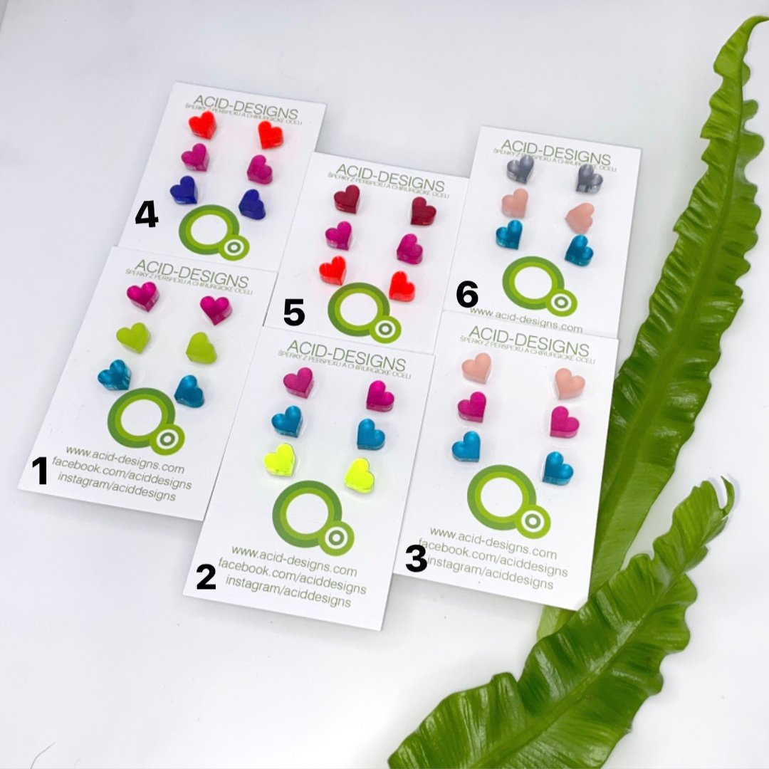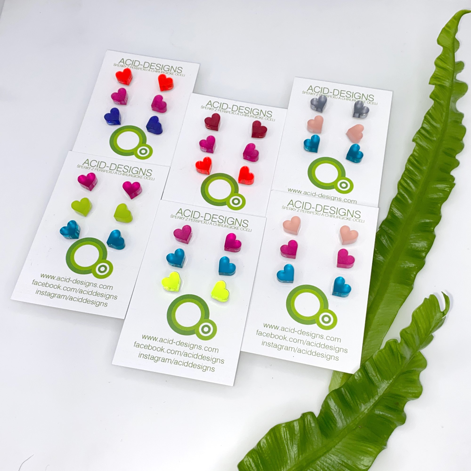 Náušnice Srdíčka jsou vyrobeny ze dvou vrstev - barevného a zrcadlového perspexu , barvy jsou tak výraznější a mají velmi působivé odlesky.